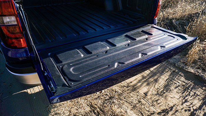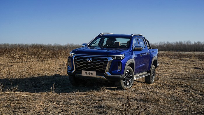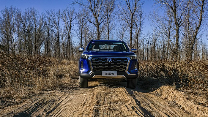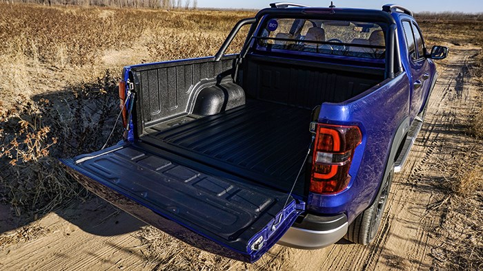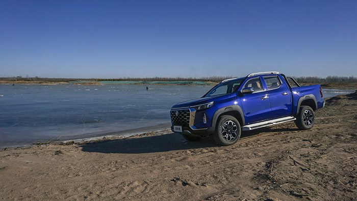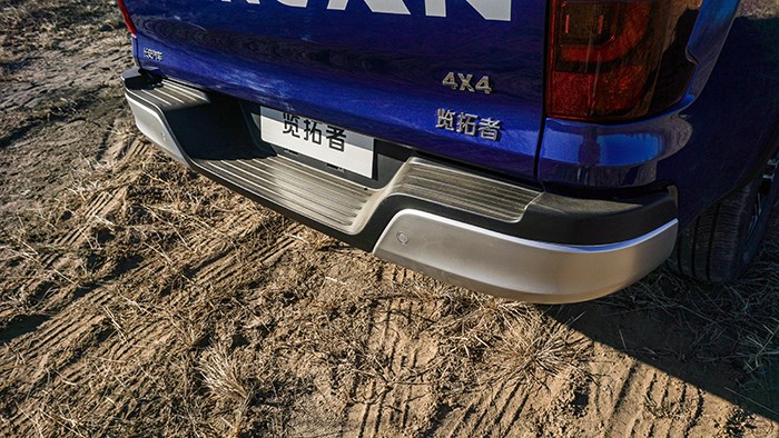 側(cè)面是標(biāo)準(zhǔn)的皮卡結(jié)構(gòu),覽拓者提供標(biāo)準(zhǔn)貨箱版和長貨箱版可選,標(biāo)準(zhǔn)貨箱版長寬高分別為5350/1930(1945)/1875毫米,貨箱尺寸為1600/1595/500毫米,長貨箱版長寬高分別為5600/1930(1945)/1875毫米,貨箱尺寸1850/1595/500毫米,值得一提的是,作為一臺肩負(fù)野外任務(wù)的皮卡車型,覽拓者接近角達(dá)到28度,離地間隙超過200毫米。