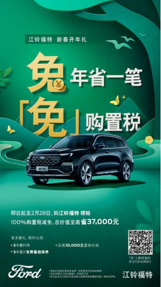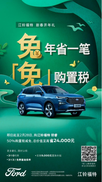 ? 面對汽車行業(yè)購置稅補貼政策已終止的情況,江鈴福特科技誠意不減!江鈴福特科技推出“兔年省一筆 免購置稅”新春開年禮活動。