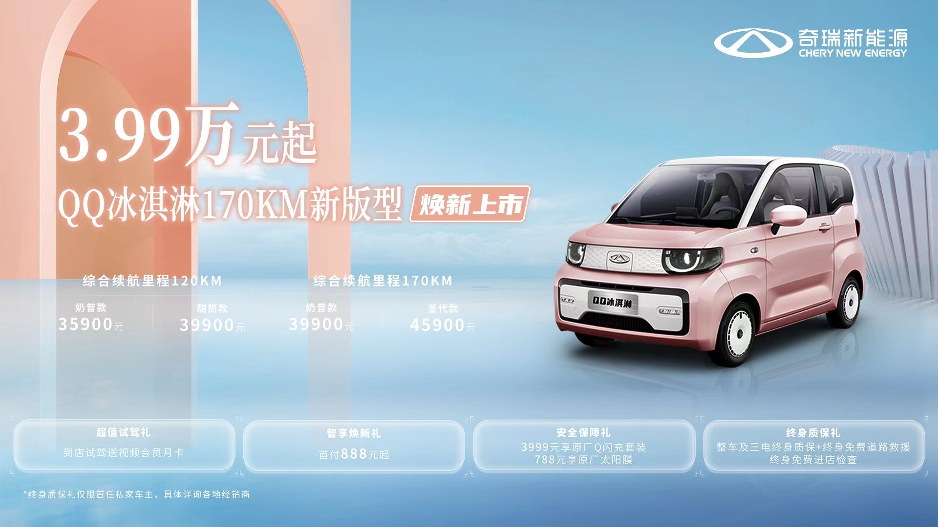 QQ冰淇淋170KM新版型上市后,為廣大年輕用戶帶來170KM奶昔款,時尚外觀升級包的增配驚喜,成為品價比最高,競爭力最強的城市出行新選擇。除此之外,為回饋廣大用戶長久以來的關注和支持,奇瑞新能源還推出四重好禮,現(xiàn)在選購QQ冰淇淋170KM新版型即享首付888元起,3999元享原廠Q閃充套裝,788元享原廠太陽膜等超值福利,帶你一起輕松開啟快樂旅程。