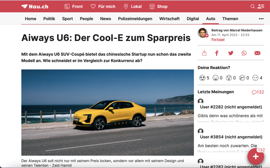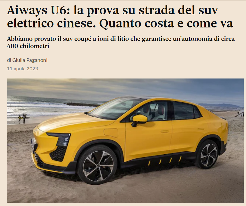 瑞士主流媒體《News für die Schweiz》:“愛馳U6驚艷的造型和車色媲美百萬豪車蘭博基尼Urus。”