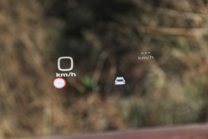 抬頭顯示會(huì)實(shí)時(shí)顯示駕駛時(shí)最為關(guān)注的信息,如時(shí)速、當(dāng)前路況限速、車身周圍情況等,如果你要是用車載導(dǎo)航或藍(lán)牙電話時(shí),它還會(huì)顯示導(dǎo)航信息與通話信息,可以說(shuō)在這一方面,大狗做的是很不錯(cuò)了,功能設(shè)計(jì)十分人性化。
