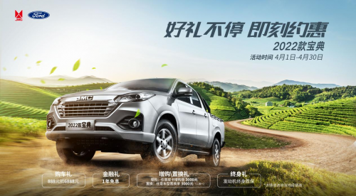 陽春四月,江鈴皮卡攜旗下2022款寶典、2023款寶典、域虎7、域虎9也特地為新老用戶準(zhǔn)備了春日鉅惠禮遇(活動時間截止至2023年4月30日),購車禮、金融禮、置換/增購禮、終身禮等多重禮遇齊放送,最高直降13000元,助力更多用戶朋友們開啟春日美好生活。