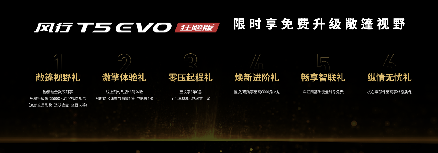而且,在風(fēng)行T5 EVO狂飚版的發(fā)布會(huì)上,隨著新車(chē)一起亮相的還有關(guān)于風(fēng)行T5 EVO狂飚版的各種購(gòu)車(chē)優(yōu)惠政策——【敞篷視野禮】購(gòu)鉑金款即刻享免費(fèi)升級(jí)價(jià)值5000元720°視野禮包(360全景影像 透明底盤(pán) 全景天幕)、【零壓?jiǎn)⒊潭Y】首付3888元包牌貸回家,至長(zhǎng)享5年0息、【煥新進(jìn)階禮】至高置換補(bǔ)貼享6000元、【暢享智聯(lián)禮】享車(chē)聯(lián)網(wǎng)終身免基礎(chǔ)流量、【縱情無(wú)憂禮】首任車(chē)主享核心零部件終身質(zhì)保,更有【激擎體驗(yàn)禮】——限時(shí)送《速度與激情10》電影票,只要線上預(yù)約到店試駕體驗(yàn)即可領(lǐng)取,絕對(duì)是最純粹的福利。