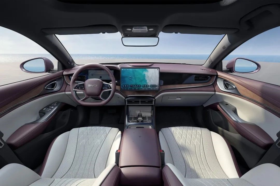 比亞迪海豹DM-i采用四幅式的運動方向盤。搭配10.25英寸全液晶儀表和15.6英寸的自適應旋轉中控屏,水晶材質的電子換擋機構。另外高配車型還帶有HUD抬頭顯示系統(tǒng),更具有科技感。