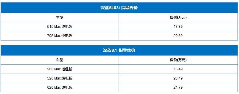11預(yù)覽6日,深藍(lán)SL03i及S7i正式上市,前者推出2款車型,售價區(qū)間為17.89-20.69萬;后者推出3款車型,售價區(qū)間為18.49-21.79萬。
