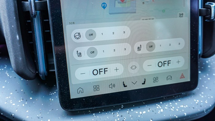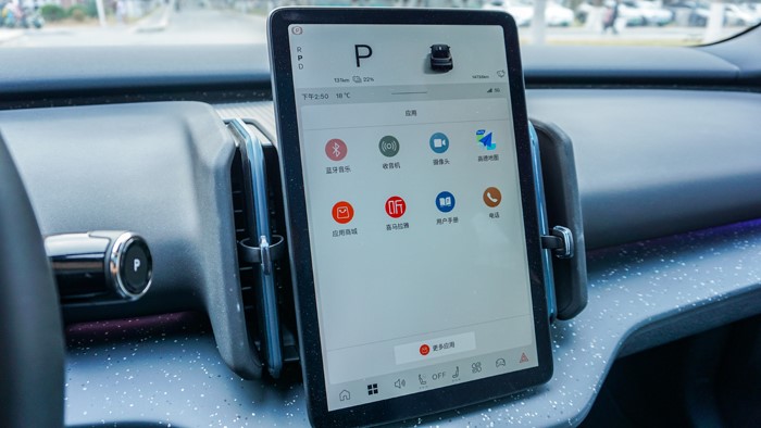 車輛時速、擋位、電能等顯示均在中央液晶屏最上方來顯示。車輛的科技配置豐富,配備了導航、行車記錄、L2級Pilot Assist駕駛輔助、B站、音樂軟件等等,車機芯片為高通驍龍8155操作順暢。