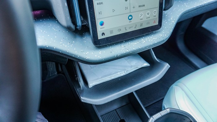 亮點設計:手套箱并不在副駕乘客座椅前方,而是位于12.3英寸觸摸屏的正下方,并只能通過液晶屏來打開,這同樣創(chuàng)造了副駕駛前方更多腿部空間。