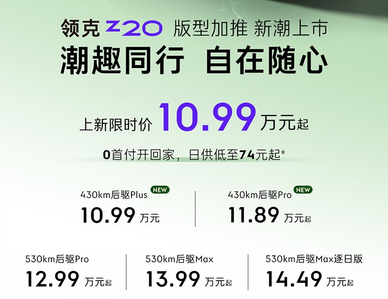 近日,領(lǐng)克Z20新增2款入門車型上市,售價(jià)區(qū)間為10.99-11.89萬(wàn),現(xiàn)款車型售價(jià)12.99-14.49萬(wàn)。新車定位為全新緊湊型純電SUV。