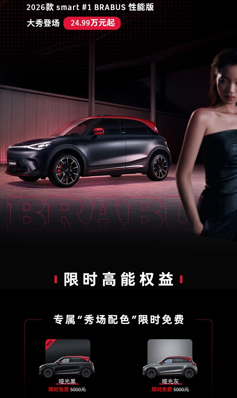 日前,2026款smart精靈#1BRABUS性能版上市,售價24.99萬。