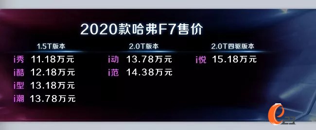 此次上市的2020款哈弗F7共推出7個版本,搭載1.5GDIT/2.0GDIT 7DCT黃金動力組合。1.5GDIT車型包括i秀、i酷、i型、i潮四款車型,2.0GDIT車型包括i動、i范、i悅?cè)钴囆停萝嚨氖蹆r區(qū)間為11.18萬-15.18萬元。