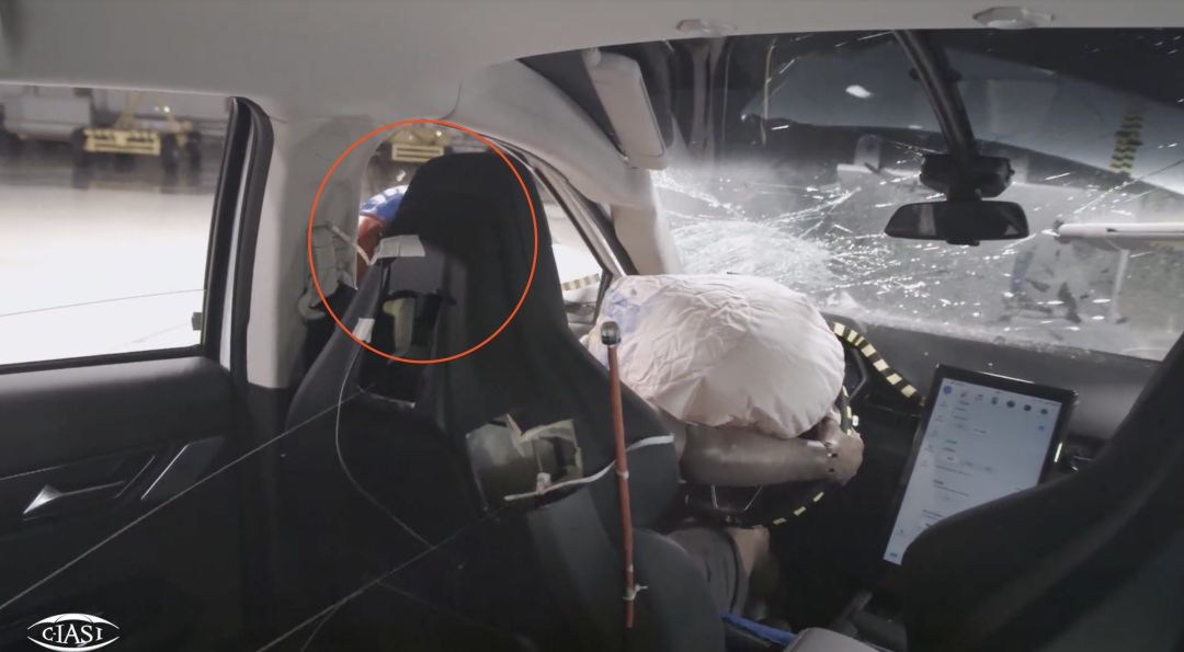 在碰撞完成后,安全帶對(duì)于假人的約束不夠,導(dǎo)致假人頭部往后“回彈”的時(shí)候后腦勺有可能撞到門框,因此盡管小鵬G3的車身強(qiáng)度足夠,但是也只能獲得A的評(píng)價(jià),這也是吃了最低配車型沒(méi)有側(cè)氣簾的虧?。。℅3從次低配起才有側(cè)氣簾)