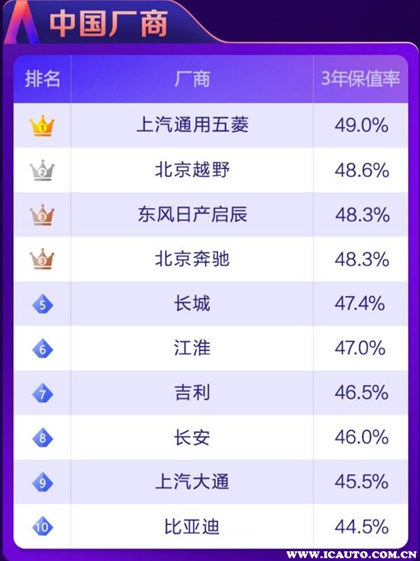 因?yàn)閲?guó)產(chǎn)車在保值率方面的表現(xiàn)比較差,所以相關(guān)機(jī)構(gòu)為國(guó)產(chǎn)車/國(guó)產(chǎn)車企專門(mén)設(shè)置了榜單排名,其中上汽通用五菱以49%的3年保值率獲得第一名的寶座,比較讓人驚訝的是北京越野居然排到了第二名,而像長(zhǎng)城、吉利、長(zhǎng)安等一線自主品牌卻均無(wú)緣前三,這個(gè)結(jié)果還是比較出乎意料的,看來(lái)賣得好的車保值率也未必高。