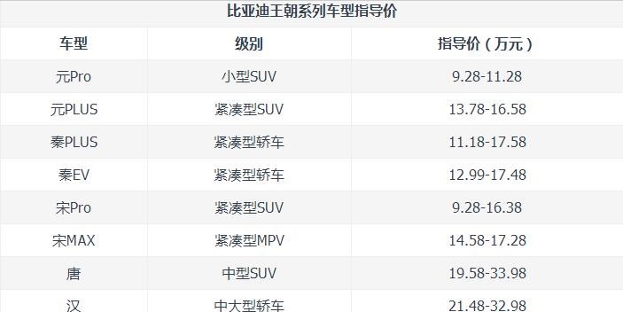 比亞迪王朝系列目前在售車型包括“秦、唐、宋、元、漢”這幾大車系,其中定位比較高端的車型主要為比亞迪漢、比亞迪唐,車型的具體售價(jià)可以參照以下表格: