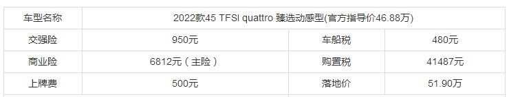 以下為奧迪A6L 2022款 45 TFSI quattro 臻選動感型的官方指導價,以及需要的上牌費、購置稅、車船稅、交強險等官方報價情況: