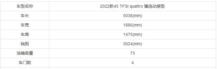 由上表可知,奧迪A6L 2022款 45 TFSI quattro 臻選動感型的車身長寬高為5038mm×1886mm×1475mm,軸距為3024mm。