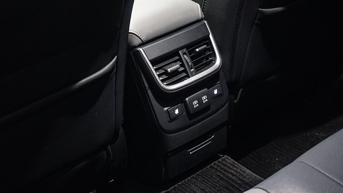 后排座椅同樣采用相同材質(zhì),同樣舒適。中央地板處稍有隆起。后排還提供了兩檔座椅加熱以及獨立的空調(diào)出風(fēng)口,并帶有兩個USB充電接口。后排座椅靠背可通過兩側(cè)的調(diào)節(jié)開關(guān)進行角度調(diào)節(jié)。