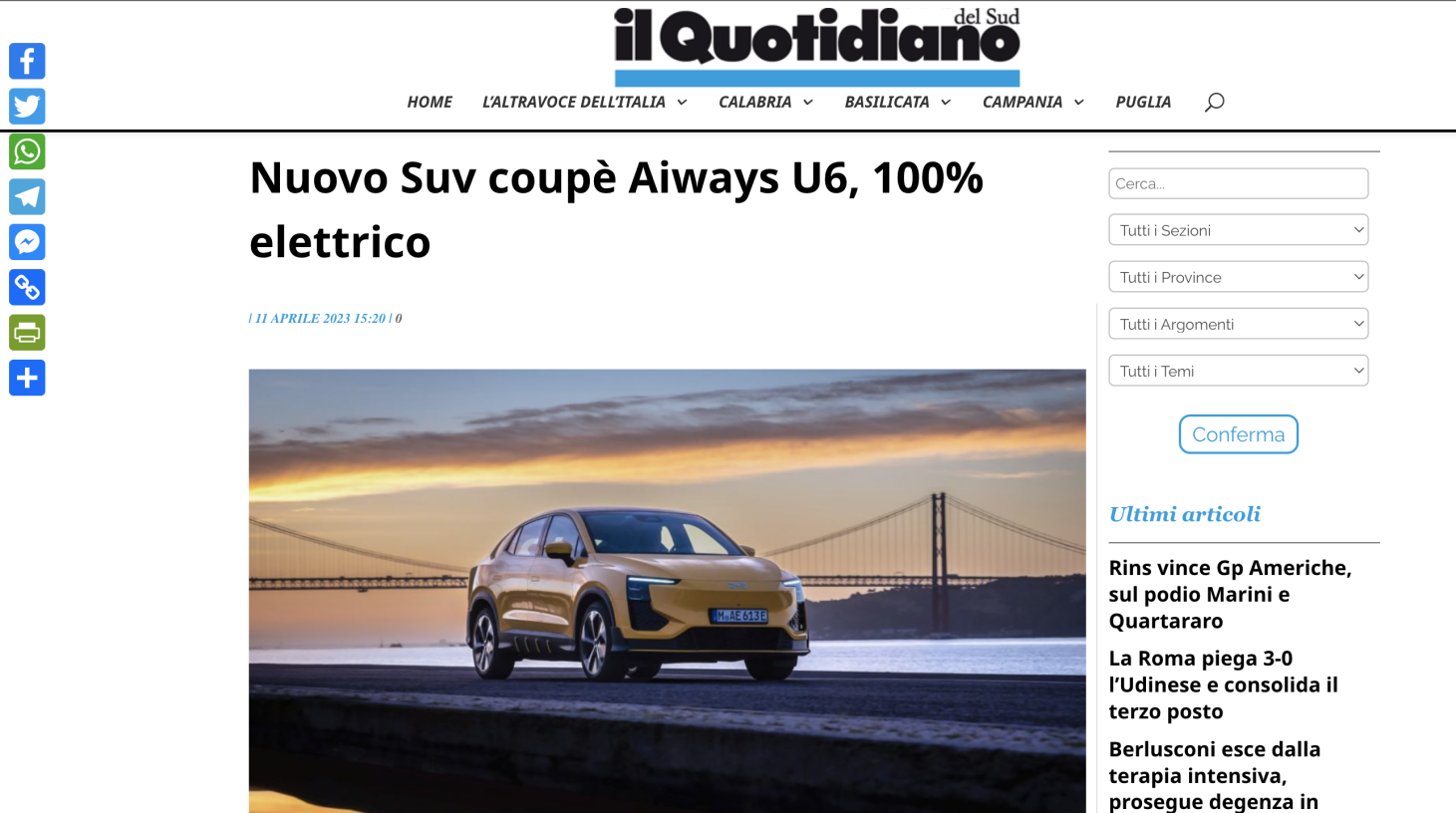 意大利媒體《il Quotidiano del Sud》:“愛馳U6可帶來非常人性化的人車交互體驗(yàn),讓座艙變得有智慧、有溫度?!?