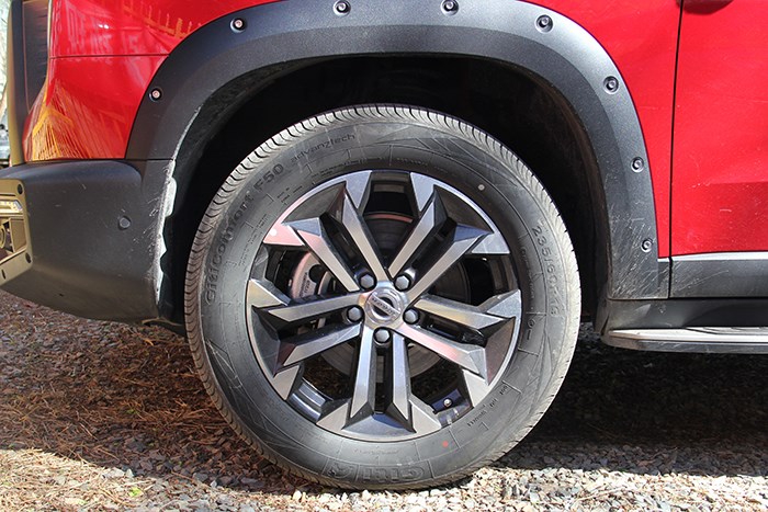 極具設(shè)計(jì)感的雙色五幅輪轂,在造型上不輸給任何進(jìn)口車型。輪胎方面它采用了偏向舒適性的佳通GitiComfort F50型號(hào),前后輪胎尺寸同為235/60 R19。輪眉上裸露的鉚釘是我最喜歡的外觀設(shè)計(jì)之一,不同于有些車型一味地堆砌夸張?jiān)氐淖龇?,大狗在外觀設(shè)計(jì)上盡量保持了克制,在粗獷與精致間達(dá)到了很好的平衡。
