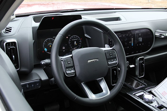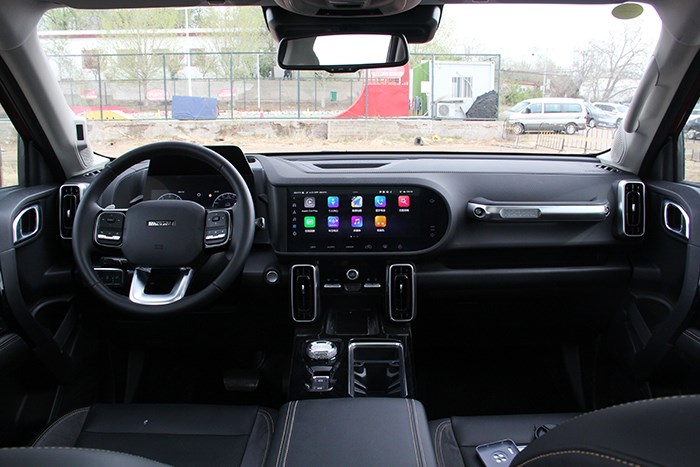 中控區(qū)域采用一塊12.3英寸大屏,在顯示色彩和細(xì)膩度方面表現(xiàn)不錯(cuò),所含內(nèi)容也十分豐富,日常駕駛與使用的功能基本上都能涵蓋上。除了虛擬按鍵外,空調(diào)、行車影像與四驅(qū)設(shè)置了物理按鍵,以滿足不同消費(fèi)者的使用習(xí)慣。這里著重表?yè)P(yáng)一下大狗的全景影像系統(tǒng),畫面設(shè)計(jì)符合大多數(shù)人的使用習(xí)慣,并且車型以線條展示,可以讓操作者更易判斷實(shí)際道路情況。