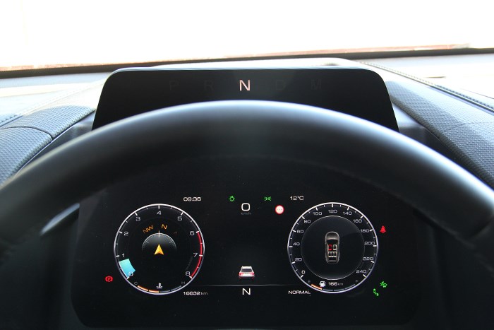 多功能儀表的設(shè)計(jì)比較有意思,分為上下兩塊,下方為液晶屏顯示,黑底白字易于讀取信息,中間的行車動(dòng)畫效果畫面細(xì)膩,借助于全景攝像頭,可實(shí)時(shí)監(jiān)控道路車輛情況,增強(qiáng)了行車安全性;上方則是單獨(dú)設(shè)計(jì)出來(lái)的檔位顯示,剛好處在方向盤與抬頭顯示之間。