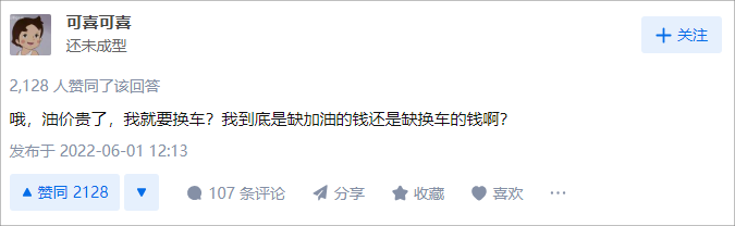在某問(wèn)答平臺(tái)上,有個(gè)很有意思的提問(wèn)“為什么油價(jià)這么貴,還是有人不愿意換電車?”答案五花八門——價(jià)格高、沒(méi)有固定車位充電不方便、續(xù)航里程焦慮等等。高贊答案,是“油黨釘子戶們”的共同堅(jiān)守,也是新能源車企們需要更努力的方向。