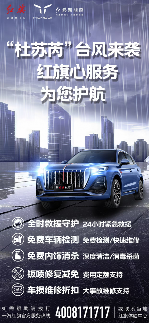 臺風(fēng)來臨前,及時發(fā)布預(yù)警信息,提醒臺風(fēng)天用車安全事項,通過微信、短信等途徑覆蓋用戶8.5萬人次,有效保障用戶出行安全。同時,紅旗品牌快速出臺專項關(guān)懷政策,為受災(zāi)用戶車輛提供“全時救援守護、免費車輛檢測、免費內(nèi)飾消殺、鈑噴修復(fù)減免、車損維修折扣”5項權(quán)益,切實讓用戶感受到紅旗品牌的關(guān)懷與溫暖。截止8月3日,一汽紅旗已累計收到車輛救援需求257臺,拖車回店220臺,現(xiàn)場維修37臺。