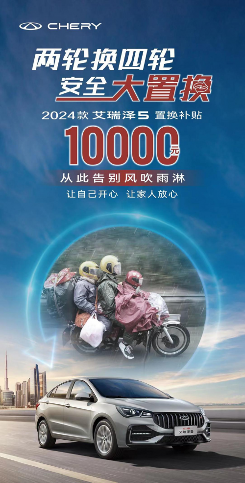 我們常說摩托車代表風與自由,但對于在嚴寒暴雪中返鄉(xiāng)的摩托車大軍而言,更多的是一種“無奈”。即便你不是返鄉(xiāng)摩托大軍中的一員,但家里摩托車常年“躺平”、放著落灰,你是否有用之不及,棄之可惜的感慨。所以,從沒車到有車,是一種生活方式的轉(zhuǎn)變。從有車到換車,是一種生活品味的轉(zhuǎn)變。你是時候用兩輪的它,“換”一種新生活了。2024款艾瑞澤5既能為你遮風擋雨,又能讓你冬暖夏涼,堪稱日常出行的最佳伙伴。更何況現(xiàn)在置換可享受10000元補貼,不要再猶豫不決了,趕緊參與2024款艾瑞澤5兩輪換四輪安全大置換活動,將心儀好車開回家吧。