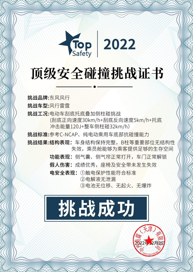 說到新能源汽車,不得不提電池的安全性能,畢竟,電池自燃可不是鬧著玩的。在電池安全保障方面,風行雷霆410續(xù)航版可是下足了功夫!它搭配了安全性極高的鎧甲電池,這可是東風風行和欣旺達聯(lián)手研發(fā)的成果。這款電池在四維超高防護盾技術的加持下,從電芯、模組、整包到整車,都進行了全方位的嚴密保護。鎧甲電池在中汽研Top Safety測試中輕松過關,順利完成了側柱碰撞、刮底、托底、浸泡等嚴苛的電池安全測試項目,展現(xiàn)出了卓越的安全性能。