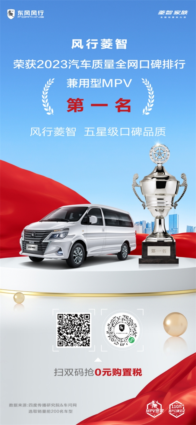出類拔萃的產(chǎn)品質(zhì)量,讓東風(fēng)風(fēng)行性質(zhì)受到行業(yè)和用戶的廣泛認(rèn)可,收獲了眾多榮譽。在日前的J.D.POWER 2024年度論壇暨頒獎典禮上,東風(fēng)風(fēng)行菱智一舉奪得“2023中國汽車產(chǎn)品魅力指數(shù)緊湊型MPV第一名”和“2023中國新車緊湊型MPV質(zhì)量第一名”兩項桂冠。而在四度傳播研究院(SAC)?聯(lián)合車問網(wǎng)發(fā)布的“汽車質(zhì)量全網(wǎng)口碑排行”中,東風(fēng)風(fēng)行菱智則在兼用型MPV中排名第一,成為屈指可數(shù)的五星級口碑品質(zhì)車型之一。