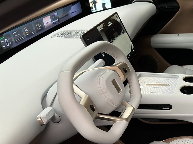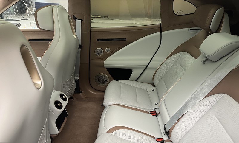 內(nèi)飾方面,新車采用雙色撞色,車內(nèi)取消大量實(shí)體按鈕,配備大尺寸懸浮式中控屏搭配上下平底三輻式方向盤。在上方還有一塊貫穿式窄條幅屏幕以及左右兩塊電子外后視鏡顯示屏。新車還提供手機(jī)無(wú)線充電、真皮座椅等,后排中央扶手還提供觸控屏調(diào)整座椅。