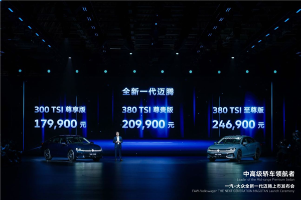 7月9日,一汽-大眾全新一代邁騰正式上市。新車推出300TSI尊享版、380TSI尊貴版、380TSI至尊版三大車型,售價(jià)分別為17.99萬(wàn)元、20.99萬(wàn)元、24.69萬(wàn)元。