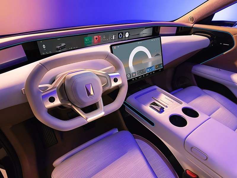 內(nèi)飾方面,車內(nèi)取消大量實(shí)體按鈕,配備大尺寸懸浮式中控屏搭配上下平底三輻式方向盤。在上方還有一塊貫穿式窄條幅屏幕以及左右兩塊電子外后視鏡顯示屏。新車還提供手機(jī)無線充電、氛圍燈等。