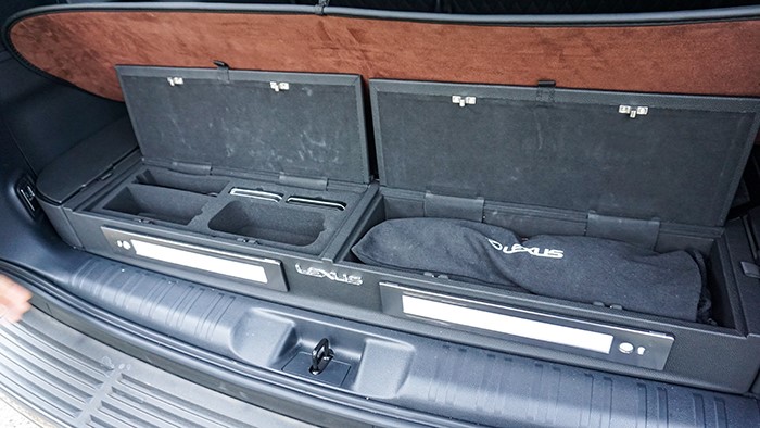 后背箱內(nèi)部帶有一個(gè)小臺(tái)面,內(nèi)部為品牌精品,像手電、拖車?yán)K、雨傘、保溫杯、甚至撲克牌都有配備。
