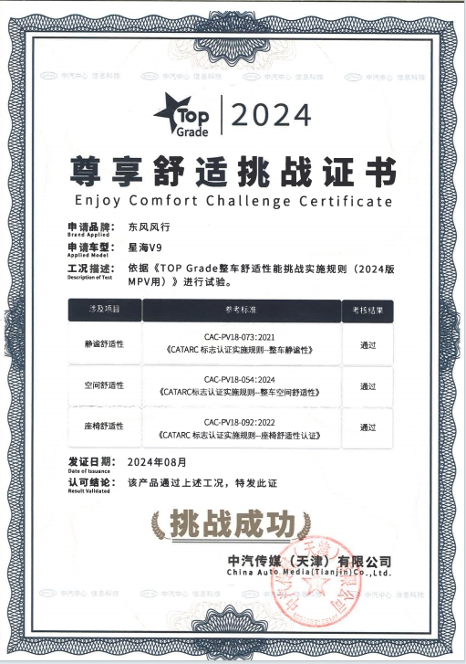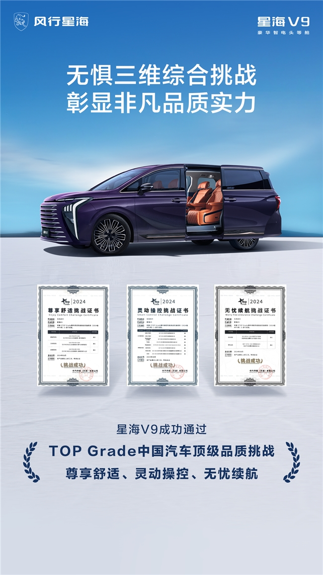 在出行需求日益多元化的今天,傳統(tǒng)轎車與SUV已難以滿足市場(chǎng)對(duì)于高舒適性、長(zhǎng)續(xù)航性及強(qiáng)操控性的綜合追求。正是這一市場(chǎng)空白的存在,促使了MPV車型,尤其是集豪華與智能于一身的MPV逐漸成為現(xiàn)代家庭與商務(wù)場(chǎng)合的出行新寵。作為風(fēng)行星海序列的首款“豪華智電頭等艙”,星海V9憑借其卓越的操控性、強(qiáng)勁的動(dòng)力以及極致的舒適度,精準(zhǔn)地滿足了消費(fèi)者的期待。近日,星海V9更以不凡的技術(shù)實(shí)力和出色的性能表現(xiàn)順利通過(guò)TOP Grade三維綜合挑戰(zhàn)。挑戰(zhàn)涵蓋了尊享舒適、靈動(dòng)操控、無(wú)憂續(xù)航三大維度,成功斬獲挑戰(zhàn)證書(shū)。