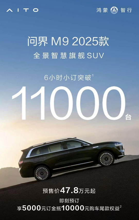 中國豪華車市場迎來新標(biāo)桿!全景智慧旗艦SUV問界M9自上市以來,以累計交付20萬輛的亮眼成績,重新定義國產(chǎn)高端車型格局。如今,問界M9 2025款正式開啟預(yù)售,預(yù)售價47.8萬元起,以“金瑞紅”新色、華為全??萍忌壖坝脩絷P(guān)懷政策,再度展現(xiàn)其硬核競爭力。最新數(shù)據(jù)顯示,問界M9 2025款6小時小訂突破11000臺,足見消費(fèi)者對其熱烈追捧與高度認(rèn)可。