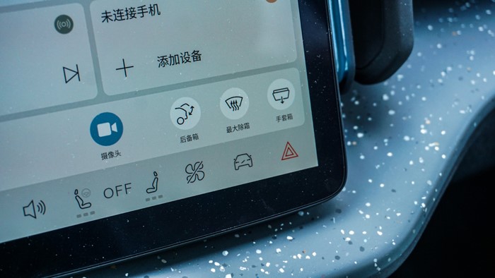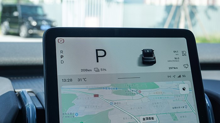 車輛時速、擋位、電能等顯示均在中央液晶屏最上方來顯示。車輛的科技配置豐富,配備了導航、行車記錄、L2級Pilot Assist駕駛輔助、B站、音樂軟件等等,車機芯片為高通驍龍8155操作順暢。