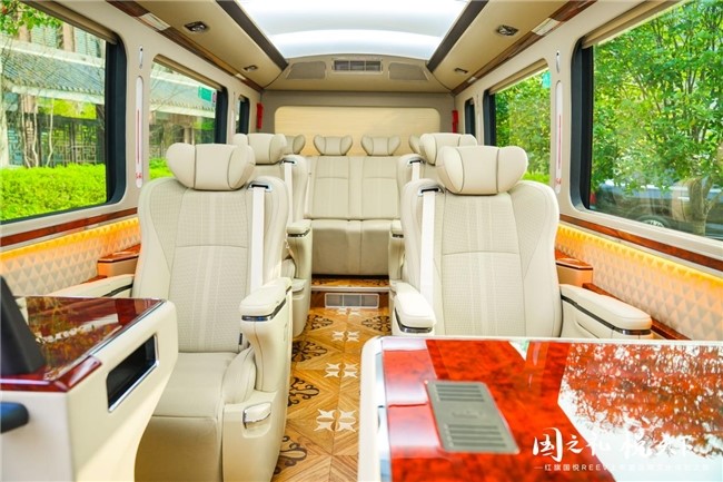 內(nèi)飾方面?zhèn)鞒辛思t旗國悅家族特點,采用超大空間設(shè)計,整車內(nèi)長5443mm、內(nèi)寬1900mm、內(nèi)高1900mm,同級領(lǐng)先。17座車型,座椅間距可達865mm,充分保證了每一個乘客的舒適性。為更好滿足不同場景的使用需求,紅旗國悅REEV提供17、19座多種布局可選。此外,行業(yè)首創(chuàng)副駕駛車門設(shè)計,極大提升了接待場景隨行人員上下車的便捷性,為服務(wù)人員提供了更好的悅享體驗。