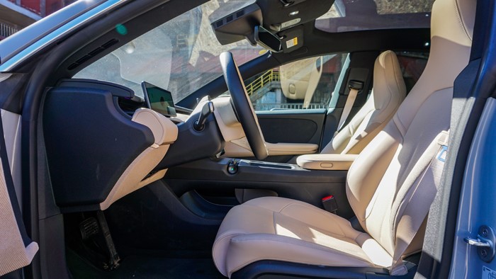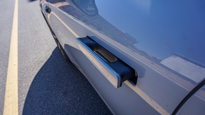 隱藏式門把手是時(shí)下純電轎車標(biāo)配的設(shè)計(jì),能夠降低一定的風(fēng)阻系數(shù)。當(dāng)你走近,門鎖會(huì)自動(dòng)彈起,反應(yīng)速度還是很不錯(cuò)的。