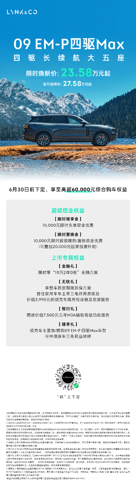 領(lǐng)克09 EM-P四驅(qū)Max大五座,不僅滿足當(dāng)代年輕用戶對大五座插混SUV多樣化出行的需求,更是送上六重福利。用戶在6月30日前下定享至高超60000元綜合購車權(quán)益,包括10000元限時領(lǐng)享金、10000元限時超級增購/置換現(xiàn)金優(yōu)惠(可疊加20000元國家報廢補貼)、“10萬2年0息”限時金融方案、價值7500元五年NOA輔助駕駛功能服務(wù)、整車固定期限質(zhì)保方案、首任家用車車主享三電終身質(zhì)保及價值3990元的領(lǐng)克專屬充電設(shè)施及安裝服務(wù)。此外,領(lǐng)克車主置換/增購09 EM-P四驅(qū)Max車型可申請原車三免權(quán)益轉(zhuǎn)移。多重福利加持,助力用戶輕松擁有全場景自由出行體驗。