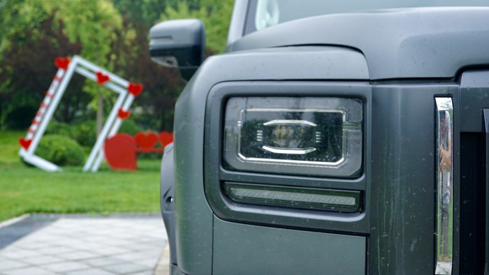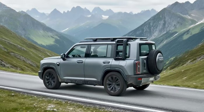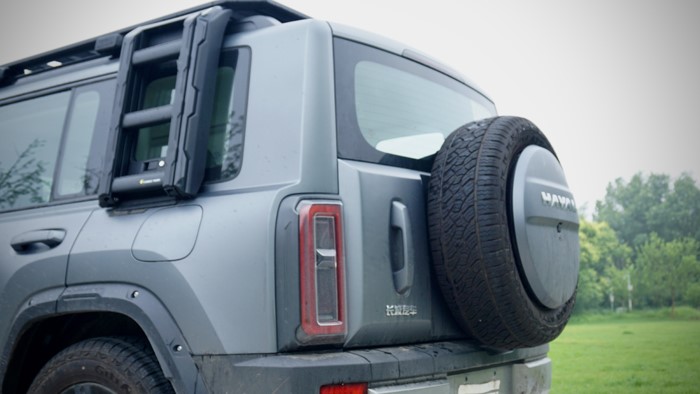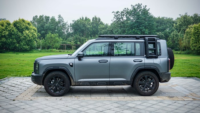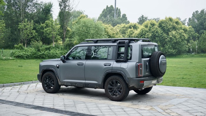 側(cè)面輪廓是典型的方盒子造型,車頂與尾部幾乎90度。車身高度適中,搭配粗獷的輪拱設(shè)計和大尺寸的輪胎,進一步增強了它的越野氣質(zhì)。車輛的三圍數(shù)據(jù):4800×1950×1822mm,軸距為2738mm,原配輪胎規(guī)格為245/60 R18,本車升級了255/60 R19的輪胎規(guī)格。