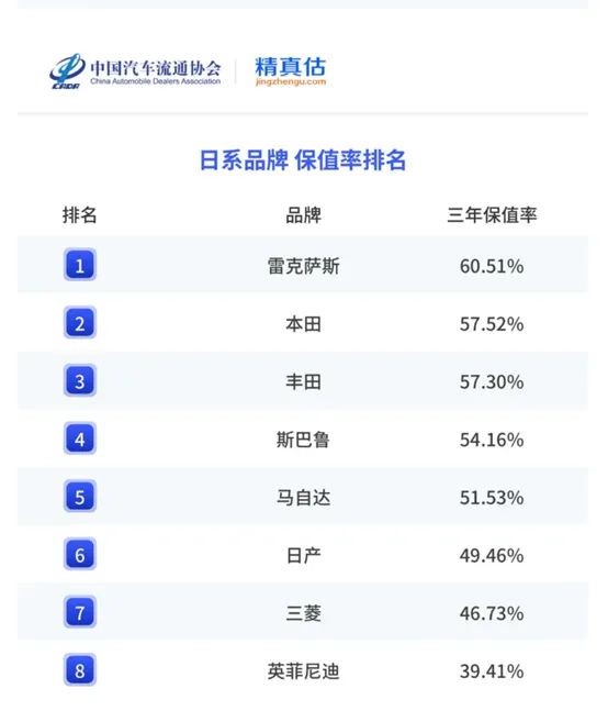 在中國(guó)汽車(chē)流通協(xié)會(huì)與精真估聯(lián)合發(fā)布的《2025上半年中國(guó)汽車(chē)保值率研究報(bào)告》中,雷克薩斯在多個(gè)細(xì)分市場(chǎng)表現(xiàn)亮眼:品牌整體三年保值率達(dá)到60.51%,位列日系品牌排行榜榜首;ES以63.89%的保值率,位居進(jìn)口中大型車(chē)排行榜第一;NX以56.18%在進(jìn)口中型SUV中排名前三。