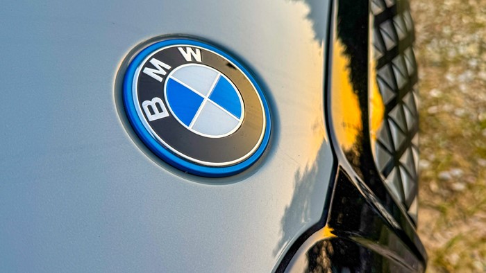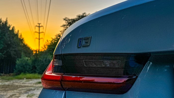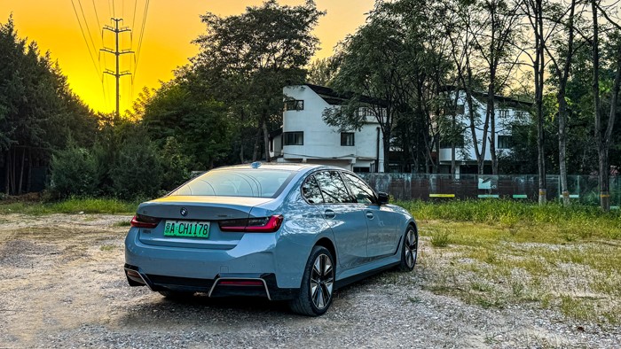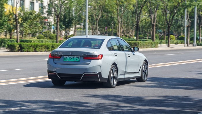 i3尾部最為顯眼的是這個大尺寸尾部擴散器,相比燃油版3系更夸張。車尾整體造型還是非常符合年輕消費者的審美的。