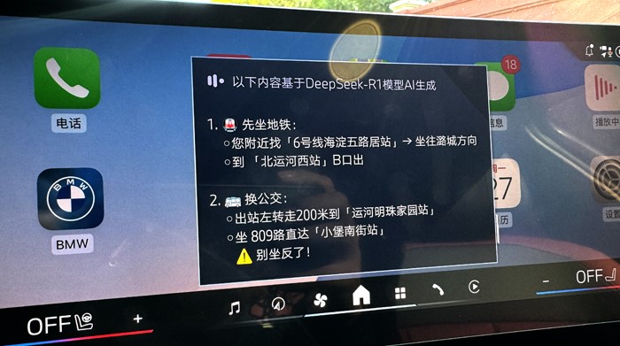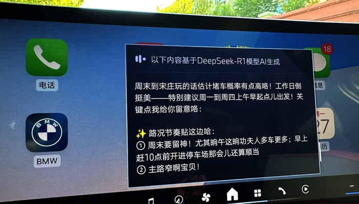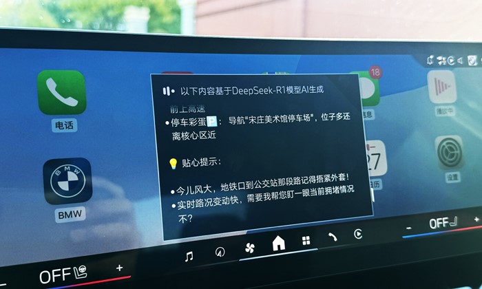 首先用語音喚醒寶馬車機(jī),開啟DeepSeek功能,你可以直接問關(guān)于宋莊畫家村的信息,相關(guān)信息會(huì)全部浮現(xiàn)在屏幕上。