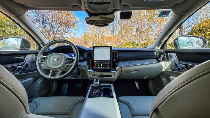 這臺沃爾沃S90插電式混動使用了大量的金屬裝飾面板配合淺白色內(nèi)飾,顯得簡約且豪華。12.3英寸全液晶儀表盤閱讀起來十分清晰。