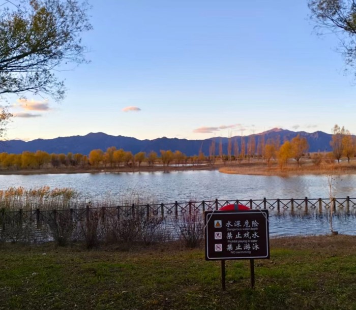 吃飽喝足就可以消食散步了,從酒店附近就是官廳水庫岸邊,在晚上這里的氣溫比北京低幾度,是有些冷的感覺了。