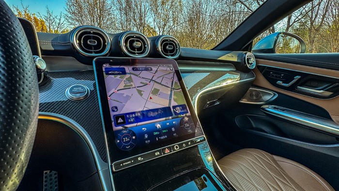這套內(nèi)飾設(shè)計(jì)截至目前為止已使S級(jí)、C級(jí)、E級(jí)等車型獲得了史無前例的豪華氛圍,在這臺(tái)CLE 300 4MATIC 豪華型身上也是如此。那優(yōu)雅的環(huán)抱式中控曲線,以及質(zhì)感滿滿的碳纖維飾板、金屬部件,讓CLE的車廂獲得了如豪華游艇般的觀感。12.3英寸的屏幕依然非常的漂亮,顯示效果細(xì)膩,黑色NAPPA真皮包裹的新款雙翼式電容方向盤握感很舒適,樣式也很招人喜歡。