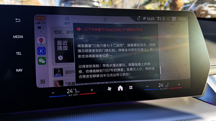 目前寶馬X1已經(jīng)上線DeepSeek功能,可以直接詢問你想了解的方方面面,非常方便。本次出發(fā)前我就問DeepSeek懷來的鎮(zhèn)邊古城怎么樣,了解到了很多知識(shí)。例如旅游、美食、交通、住宿、天氣穿衣等等,DeepSeek都可以為你回答,這個(gè)功能實(shí)在是太有意思了。